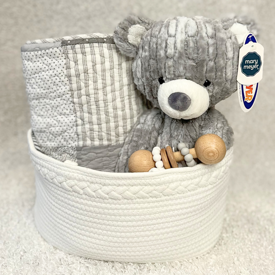 Our Gray Quilt baby gift set is a warm-yet-elegant way to welcome any new baby boy or girl into the world. The perfect baby shower gift, this set includes: